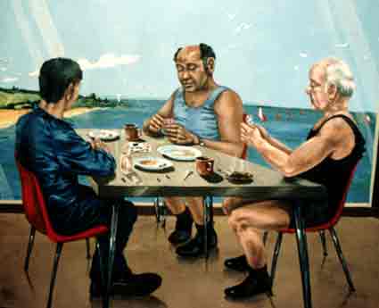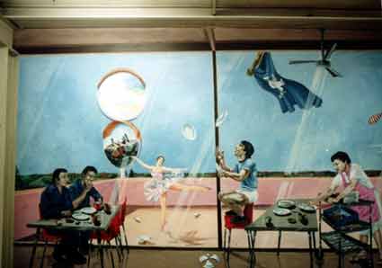 force. The artists observations of the multi ethnic make up of the workforce are expressed in many levels of detail, for example the pie warmers are nowadays stacked with rice steamers.